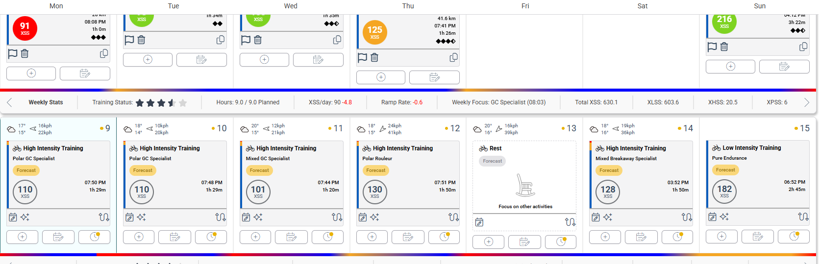 My adapt forecast button had the red dot today as there were some recovery issues it had foreseen in a month or so time. I hit the adapt forecast button, and it has created me an entire week of intervals this week, as shown below. Prior to this it I had intervals planned for Tue/Sat only and the rest were “blue” sessions.