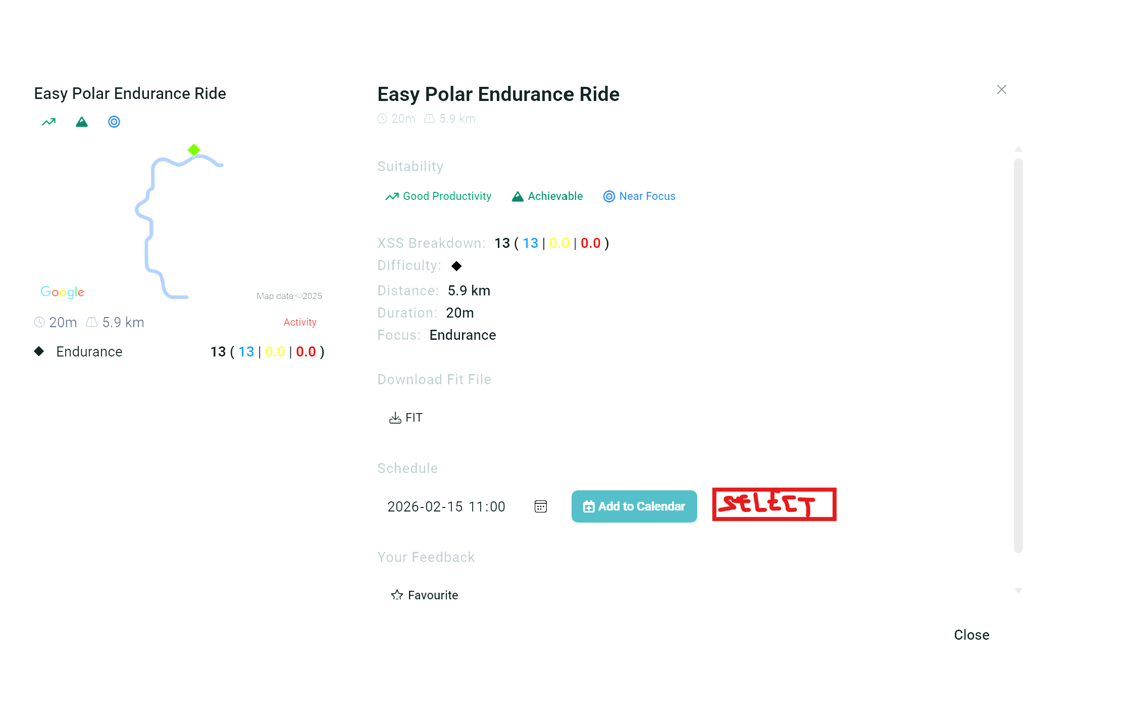 Or you can add it to the calendar to mark it as a planned activity (something to complete in addition to your forecasted training for the day). On an XATA plan, you can add it to your calendar to make the XSS from that past activity as your planned training for the day.
