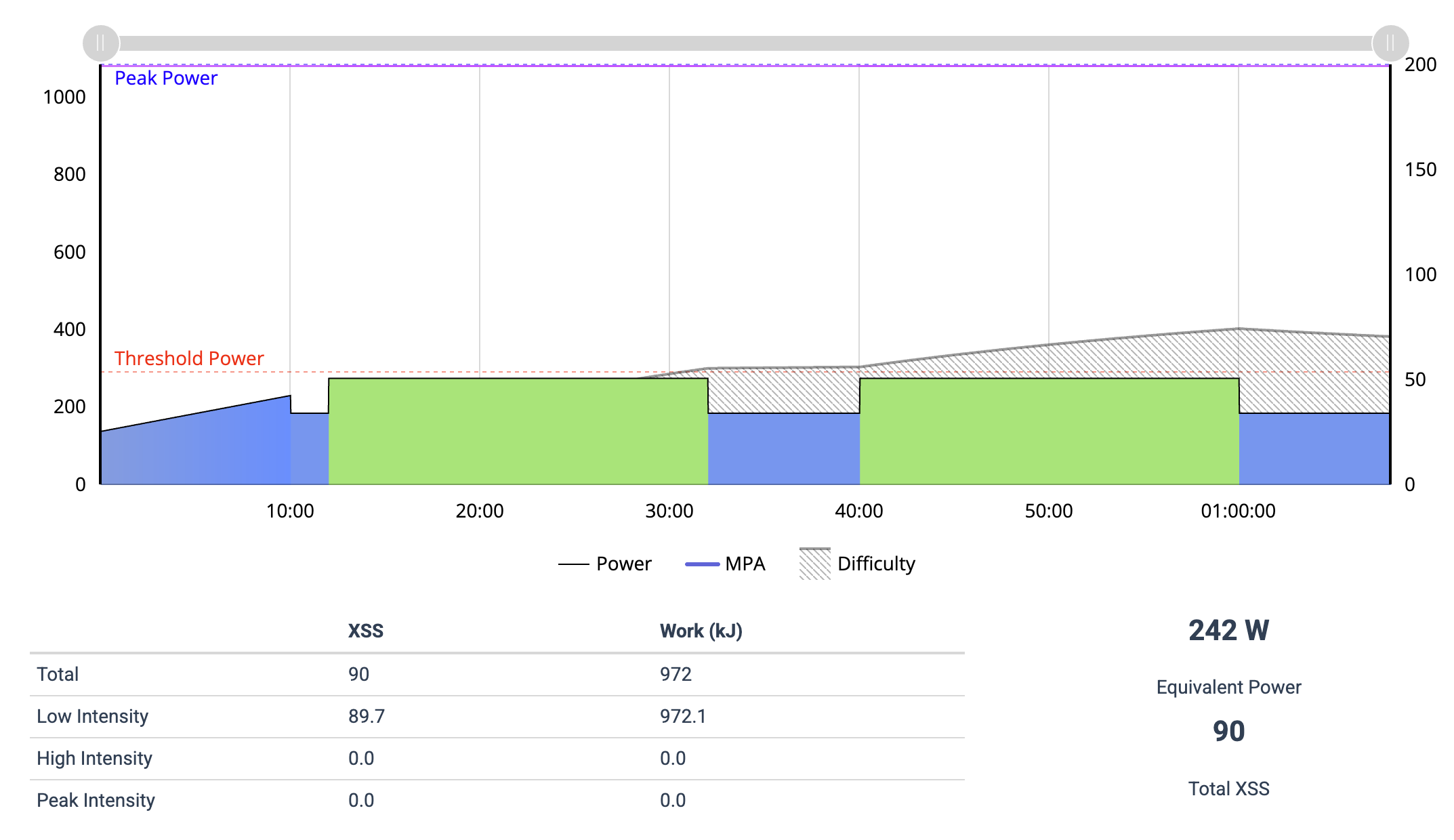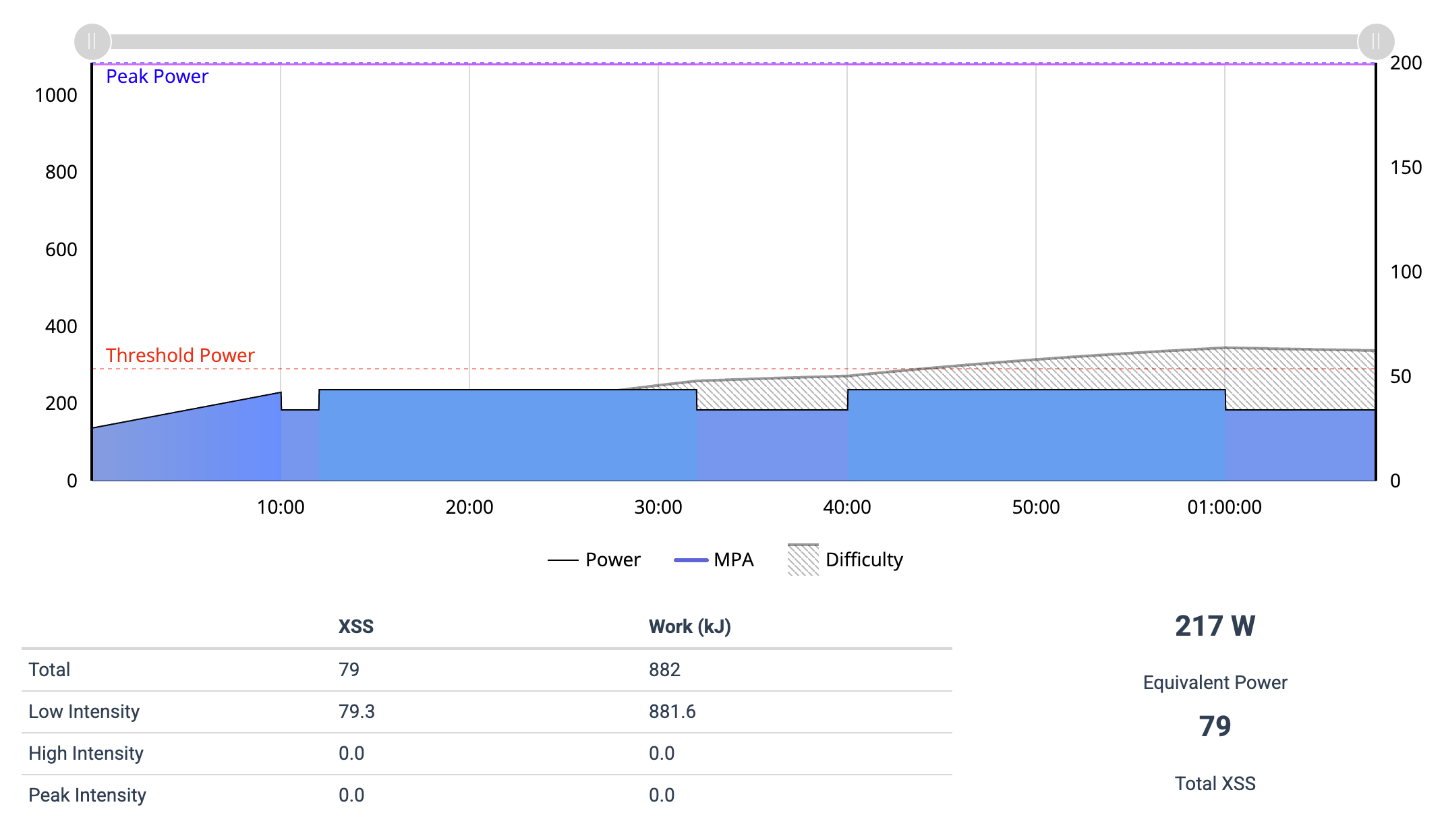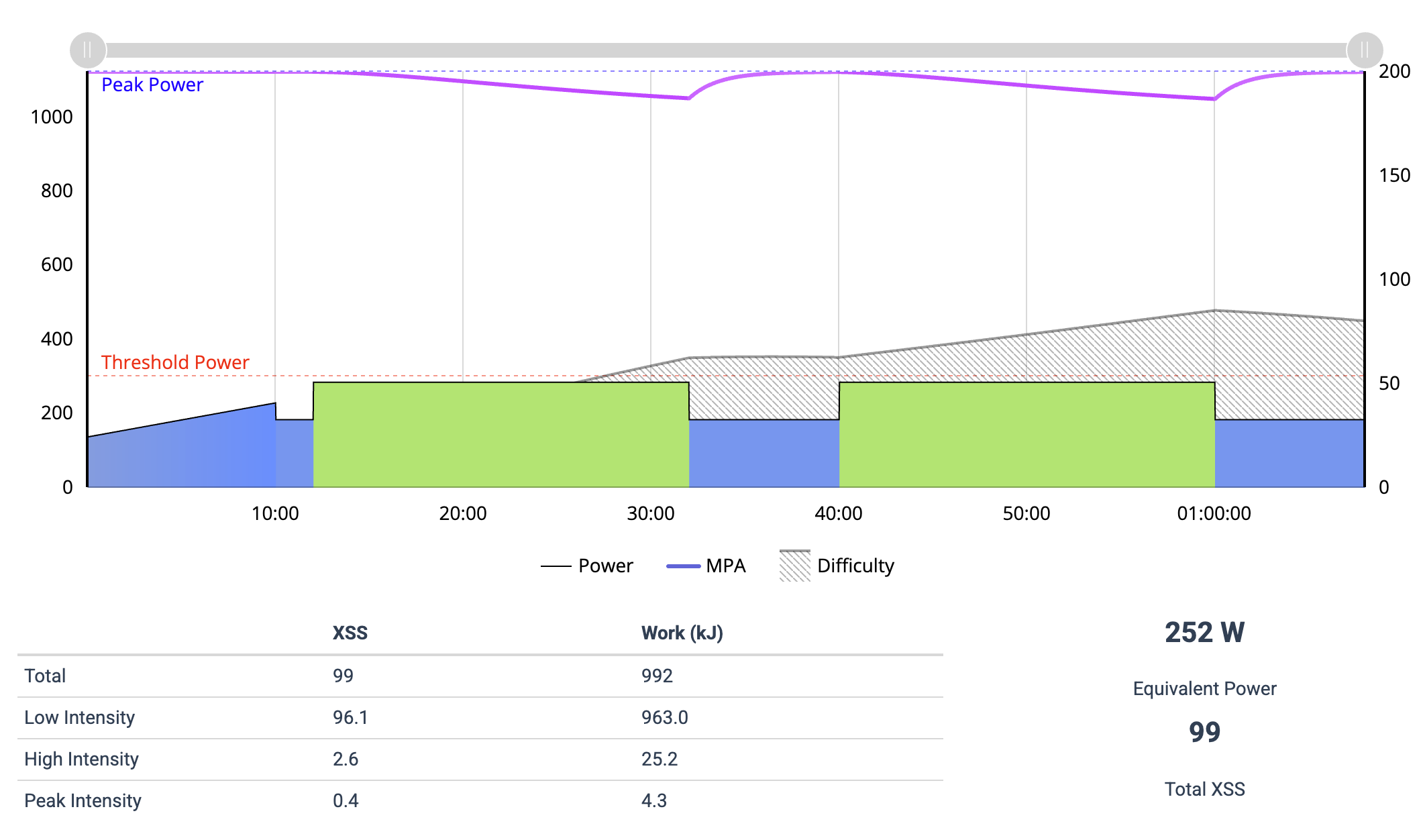 What youâll notice first most likely is that MPA comes down at 95% of TP in 2.0. Thatâs new and we think this will improve the MPA model overall. This drop in MPA is due to XHSS being accumulated below TP. Note the differences in XHSS (and XPSS too) between the two workouts. Youâll also notice the differences in XEP and Total XSS. You can also visually gauge the difference in difficulty scores. 2.0 will better reflect the recovery demands since it will make your training status more likely to be yellow after doing this workout.