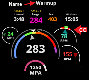 In addition, you’ll see the Cadence Optimizer (CO) gauge which shows your preferred cadence at torque. That means you can deliberately target a cadence or ride above or below your natural cadence during any interval, work or rest portion, on any workout.