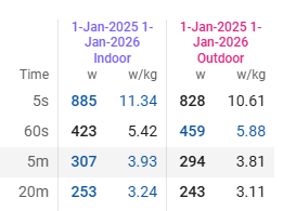 Not 100% sure since they are different power meters (Wahoo Kickr Bike indoors and Favero Assioma outdoors). Here are the key numbers for inside vs outside for the last year. They track about like I would expect. I ride indoors about 4 times as much as outside. Most of my breakthroughs come from outside group rides though.