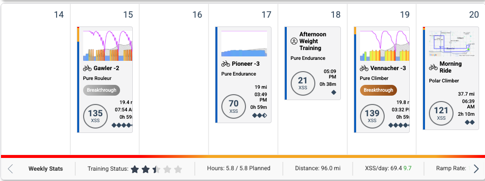 I notice that you’re around 2.5 star status. Another anecdotal point I wanted to add in is that I’ve historically found that my ability to recover was also a function of my training load/training status. I found that I generally recovered better (and felt stronger longer into rides) when my training load was at least 3 stars or higher. Makes sense… more training load = greater durability