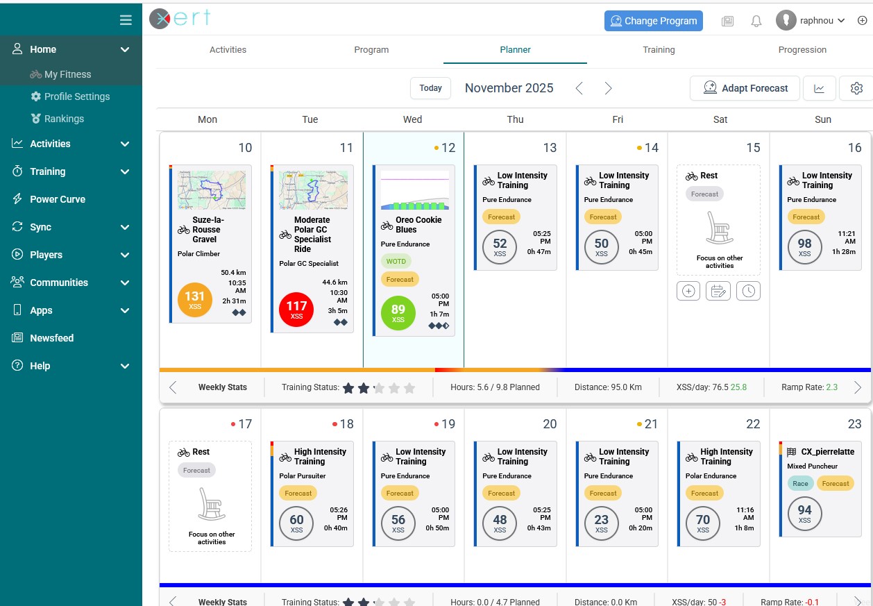 Ce que je ne comprends pas aussi, pourquoi Xert me fait faire autant de séances pendant la semaine de compétition, je crains de perdre mon influe nerveux pour la course du 23 novembre…