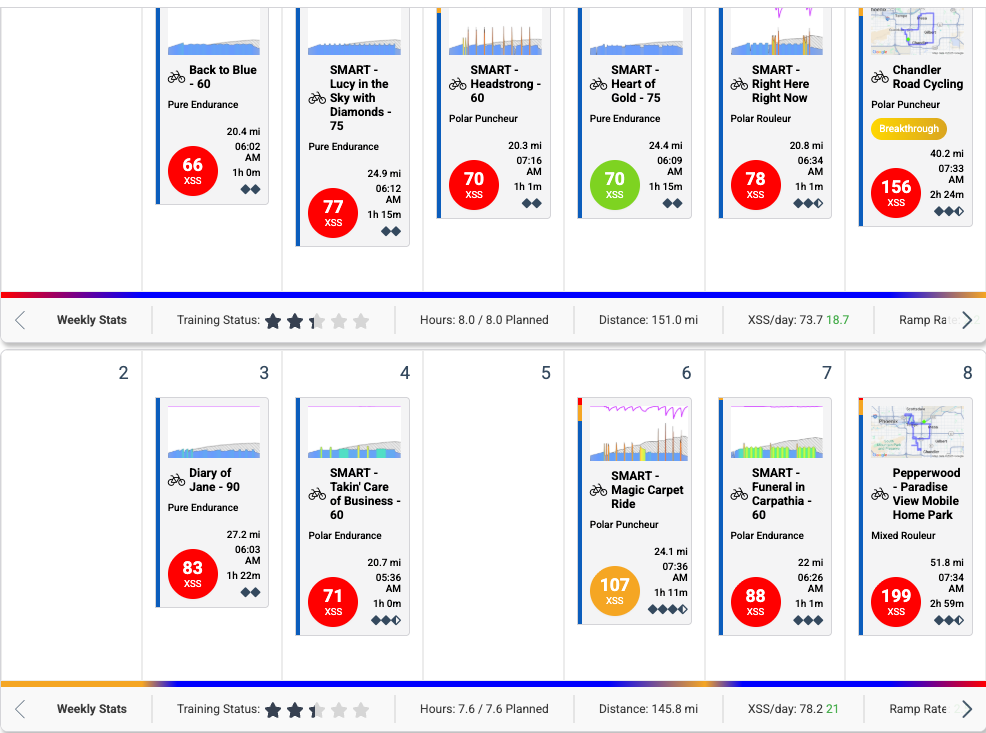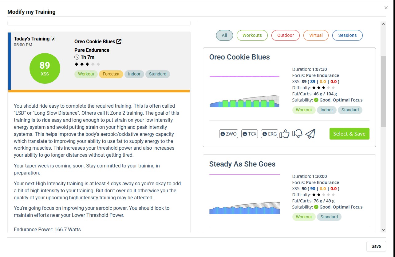 One thing I thought I would ask - are you following the auto-selected Workout of the Day? It’s totally okay if you are. The auto-schedule WOTD feature will pick one of the top 4 recommended workouts each day as the WOTD. For endurance days, I’ve found that system might tend to pick “higher intensity” endurance workouts (like tempo or sweet spot), since they’re more time-efficient. If you’d prefer not to do those types of workouts, you can give them a Thumbs down and they’ll be far less likely to be recommended or scheduled for you. For myself, I prefer to simply free ride on my endurance days (indoors or out) at a relatively easier intensity (call it sub-LTP, “Zone 2” or whatever) until I accumulate the recommended XSS (our Magic Buckets data field has made this much easier to do on the fly). This means the low intensity training might take a bit longer, but in my experience, I have found that it makes the training a bit more sustainable from a day-to-day perspective.