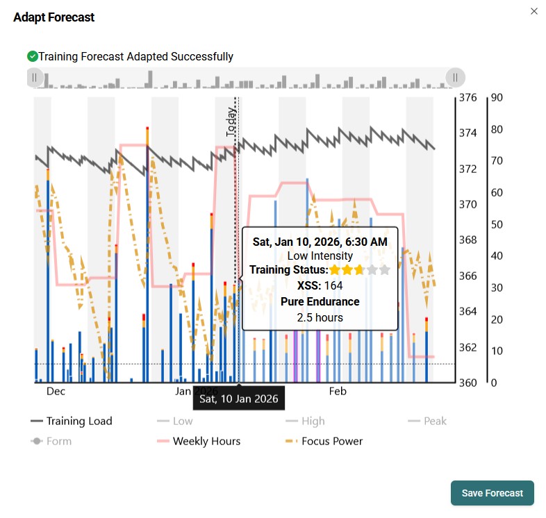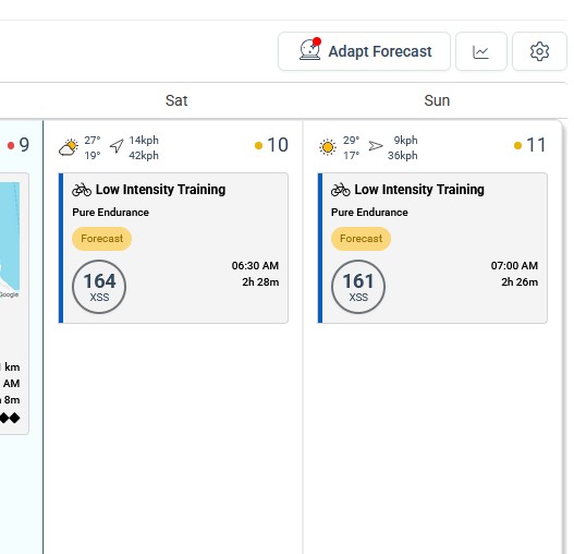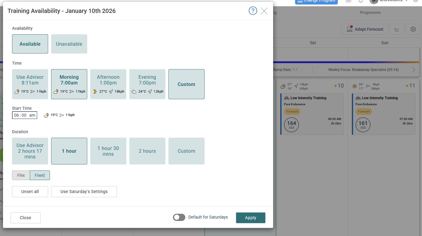 Not sure if this has been raised before - my default for Saturdays is 2.5 hours but tomorrow I need to reduce to 1 hour. I have manually changed my availability on 10th January to 1 hour and saved, and then updated the forecast and saved. The recommended workout doesn’t change - 2.5 hours endurance. Also the ‘red dot’ doesn’t clear from the ‘Adapt Forecast’ button.