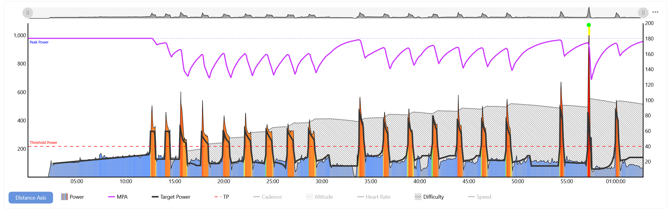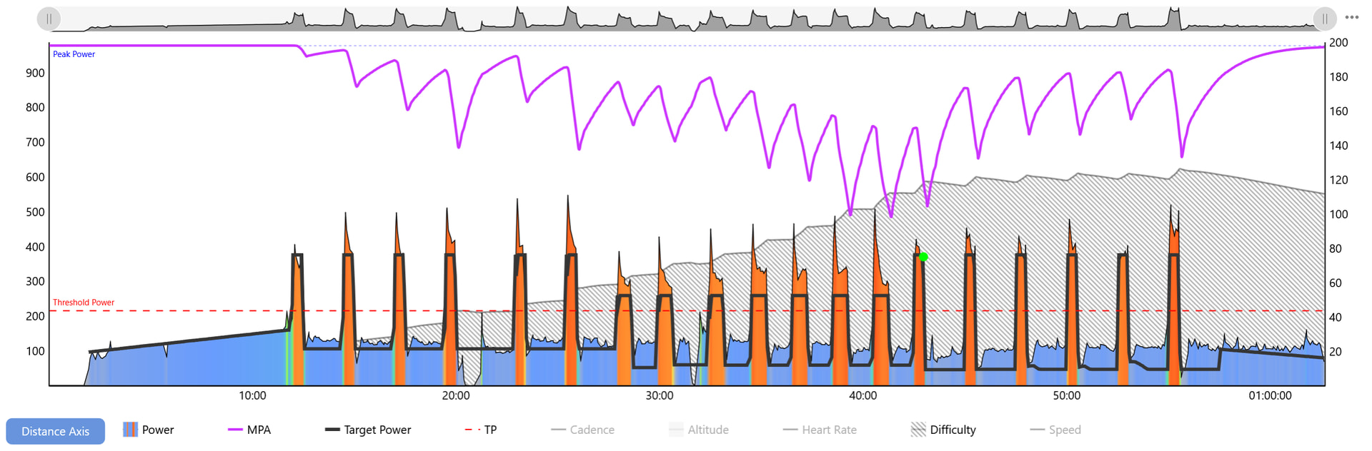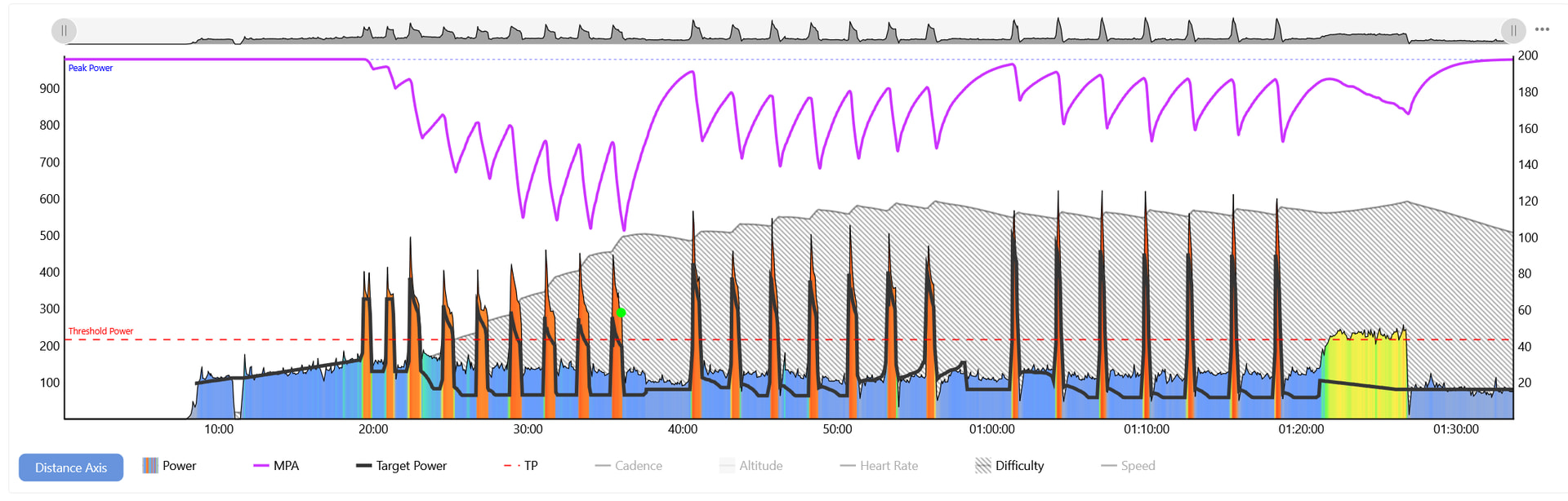 Part of the question stems from an imperfect understanding on how the intervals are prescribed - I hardly get intervals above 3minutes, so I figure that also means going harder rather than easier. In classical FTP models power always way above threshold, more like VO2-zone, although not long enough to get HR that high… Also with the MPA chart being orange/red in the intervals it signals me to “go hard”, too.