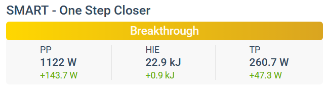 Further: 14d ago I did One Step Closer, too. Not only did I complete it, I was pushing slightly higher watts throughout and got more TSS for the same part of the workout - but got no kind of BT though