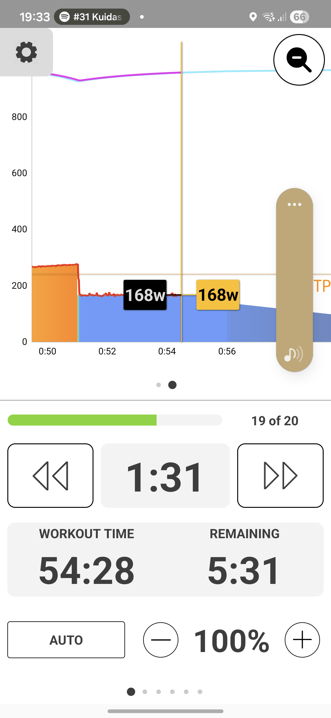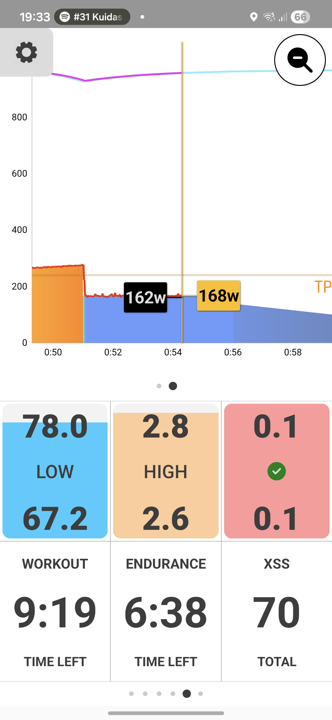 Note the delay to target watts at the start of each interval. If you have a long set like this, you can see why high/peak pts will be short of workout targets.