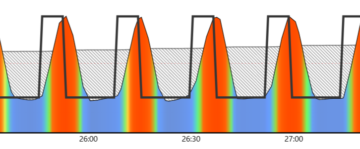 Larger discrepancies between XSS recorded versus workout targets can be explained by trainer responsiveness during interval transitions. This varies by trainer brand/model and flywheel weight. This is most obvious on short spikey intervals as in this example: