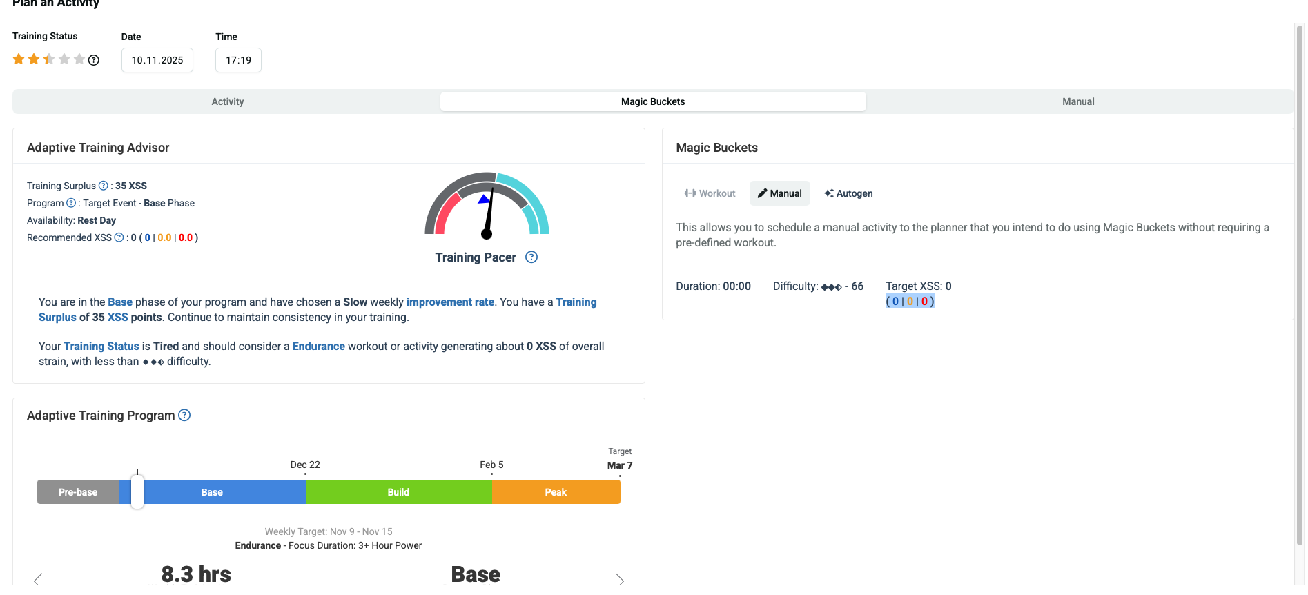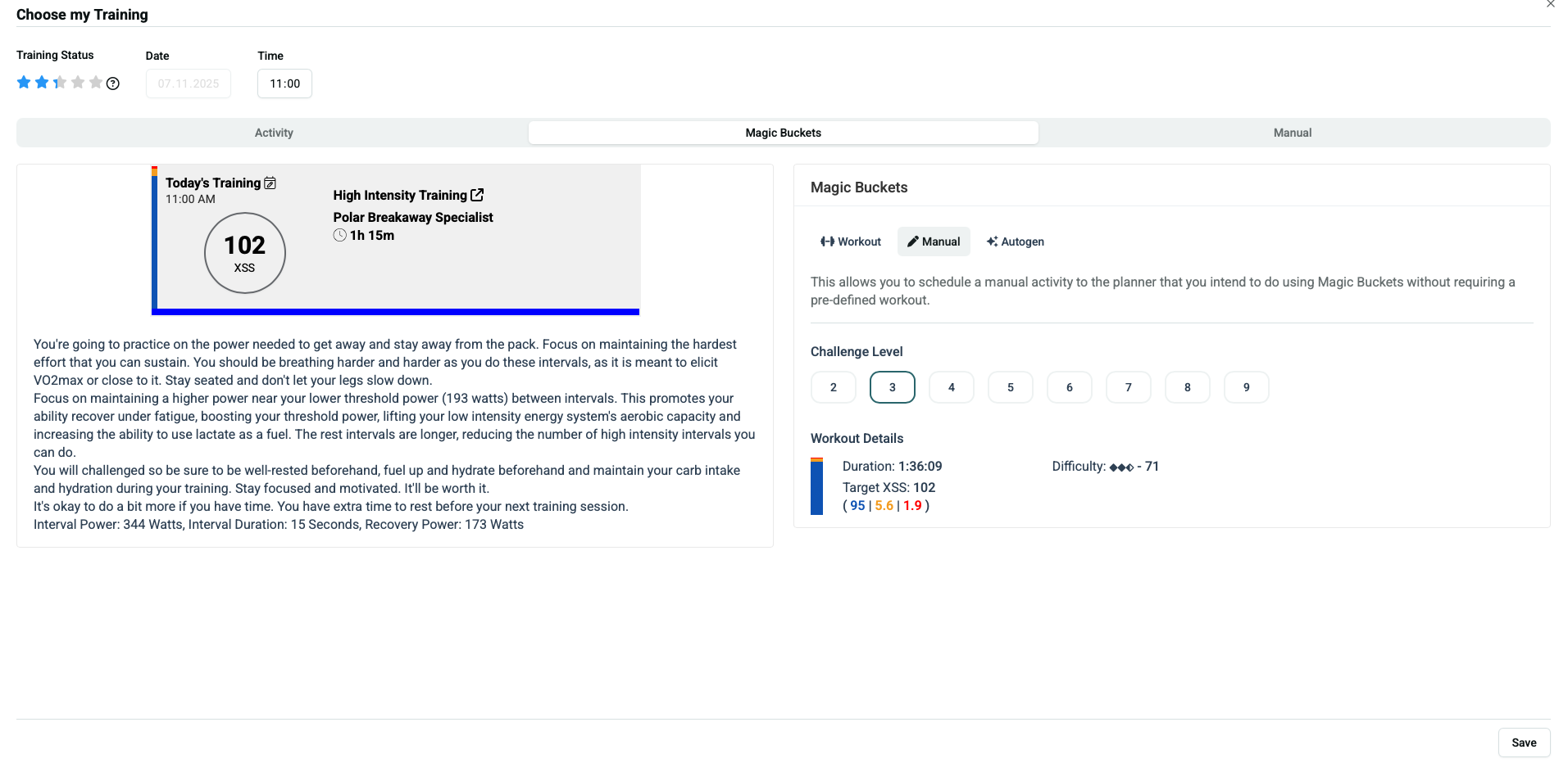 Option B: Use the Manual tab and set your own low/high/peak values. The entry on the Training page will be labeled XMB RIDE CLx. The XMB app will fetch that XSS ratio. No workout is selected.