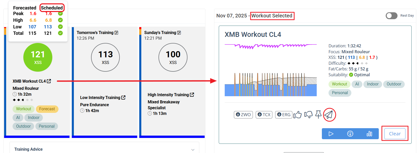 With no workout is scheduled XMB fetches the top-level advice for the day which is the XSS ratio of low/high/peak XSS. On HIT days that will be xxx|xx|xx in proportion to the targeted Focus and Difficulty (ex, 2-diamond Rouleur over ~90 minutes). On LIT days it will be xxx|0|0 (pure endurance). Or a default of 27|0|0 on rest days (active recovery).