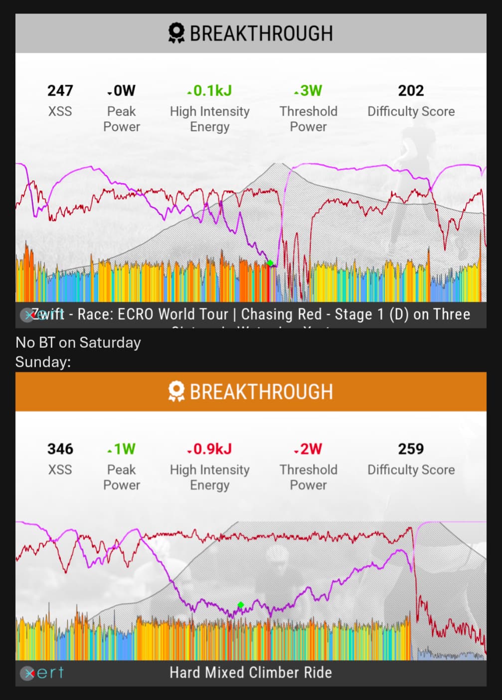 I find it a bit hard to see how far I am from a breakthrough (in XMB) (when getting close to it). Maybe this could be improved somehow? Especially outdoors when you might be out of the sadle and the light be changing a bit due to shadows from trees or buildings. Maybe I am just getting old ![]()