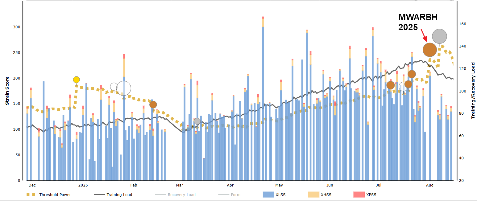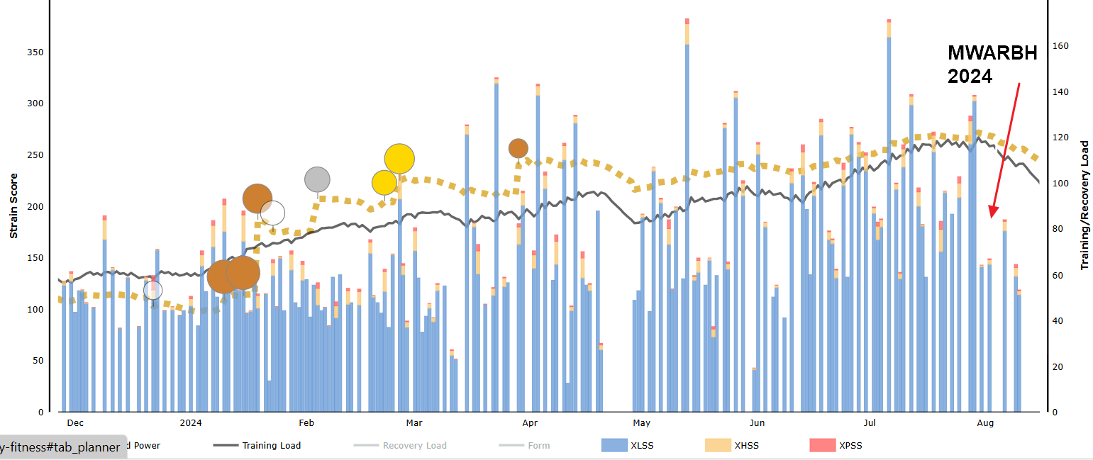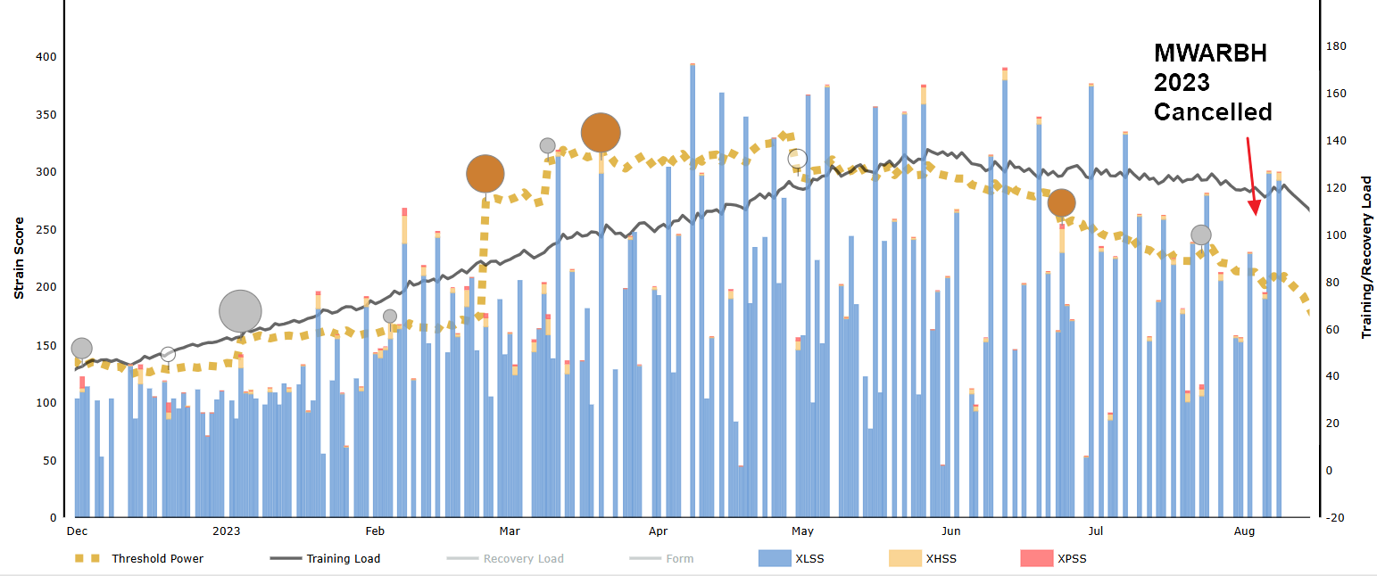 Prep: Two XATA Base-Build-Peak progressions. first starting in Dec and peaking in April then a week in XATA Continuous before initiating another progression. Capped out hours prior to event in mid-August.