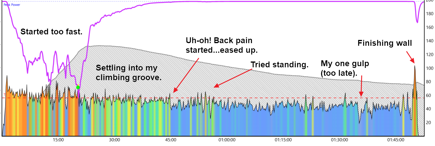 Left leg inner thigh cramps during last mile but pushed through them (very sore the next two days). No doubt due to lack of hydration, but I wasn’t able to fuel like I normally do. Too awkward handling a water bottle with pedaling effort required. There are only a couple brief respites on the climb. I missed the first one and only got one gulp down on the second. Bottle should have been empty well before the top. That didn’t happen.