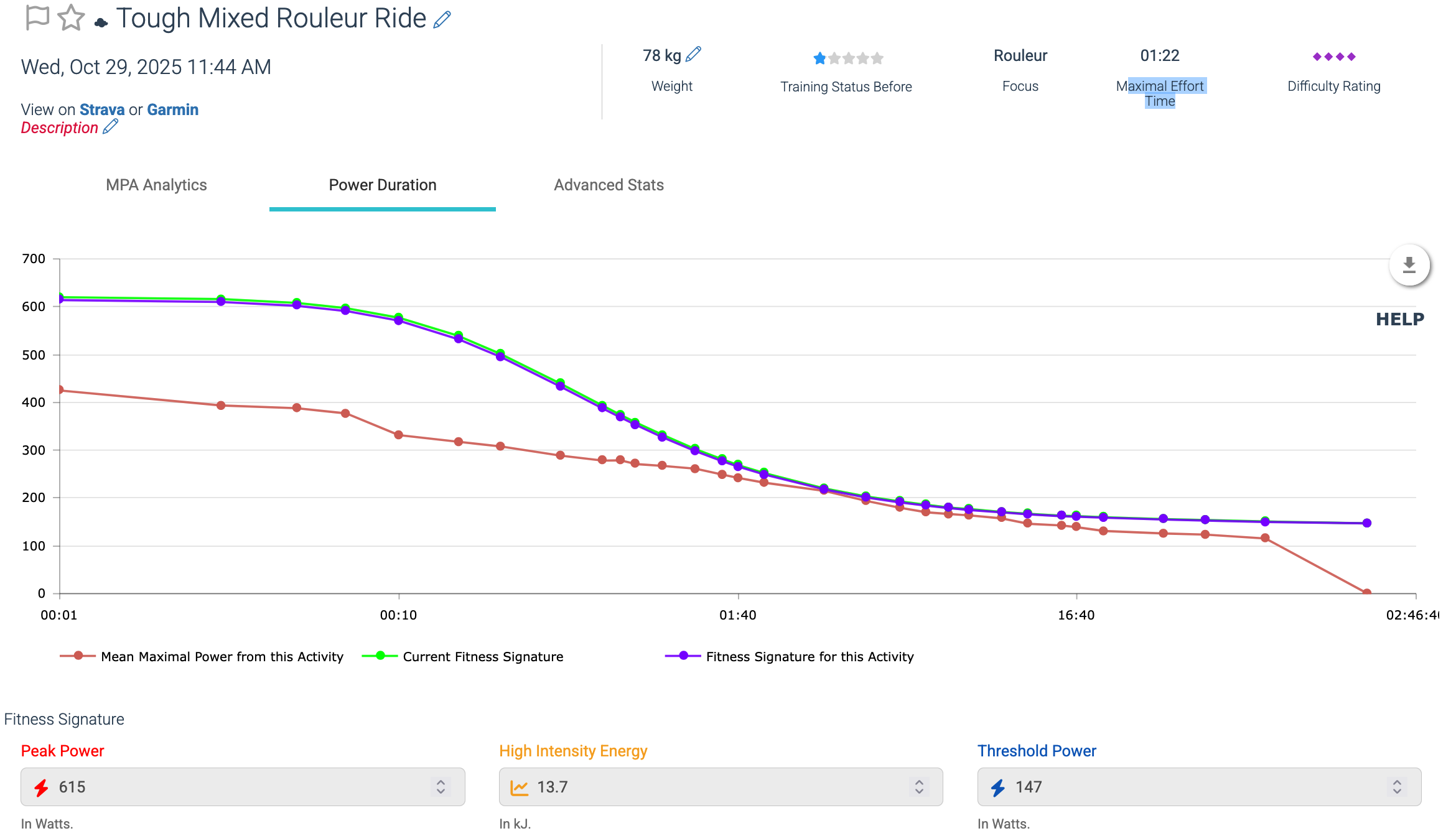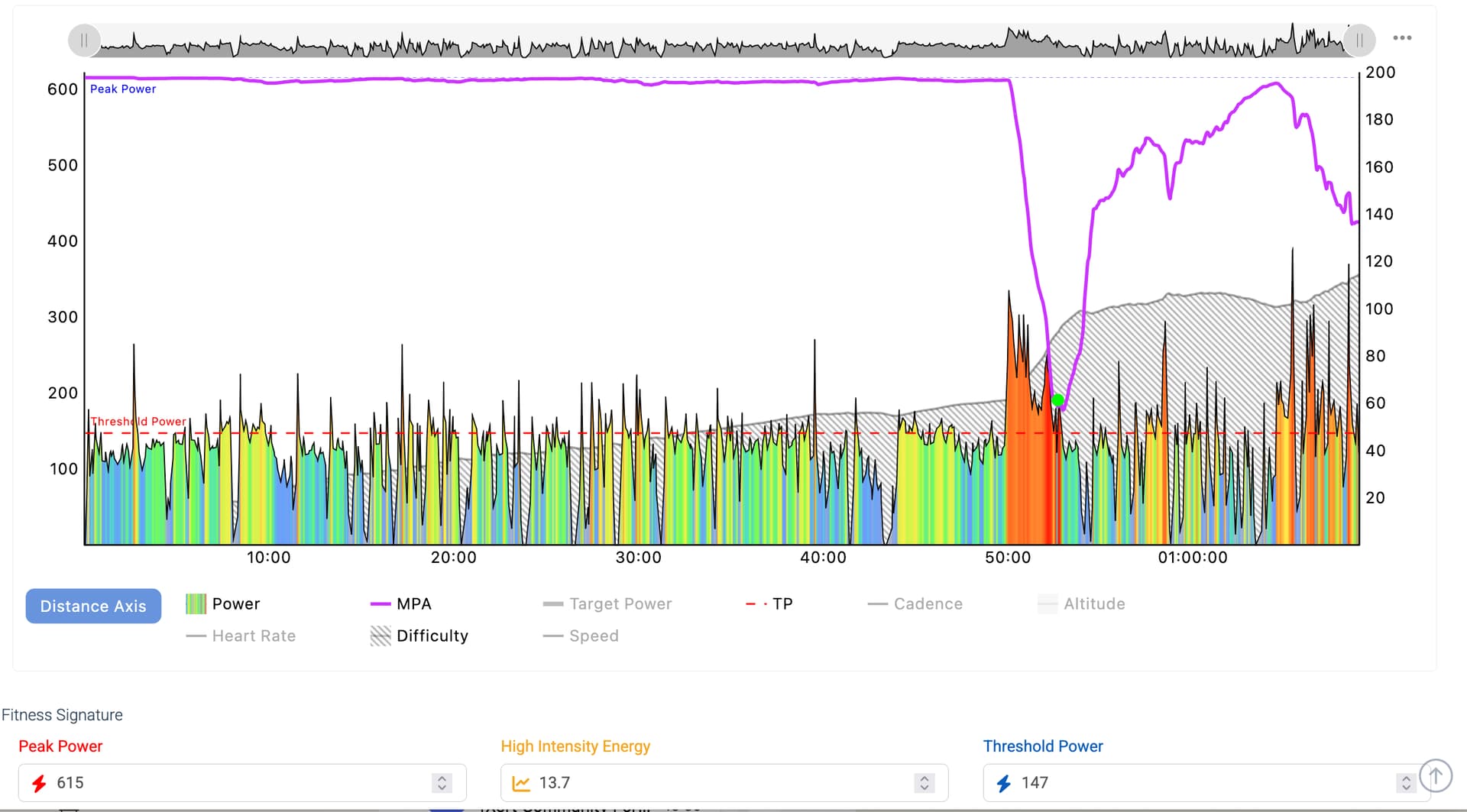 It’s likely your signature is understated if that ride was not 4-diamond Tough at the end. You did draw down MPA enough to trigger a BT and kept it down till the end of the ride. But unless you were really suffering during that section the Difficulty Score >110 was not warranted.
