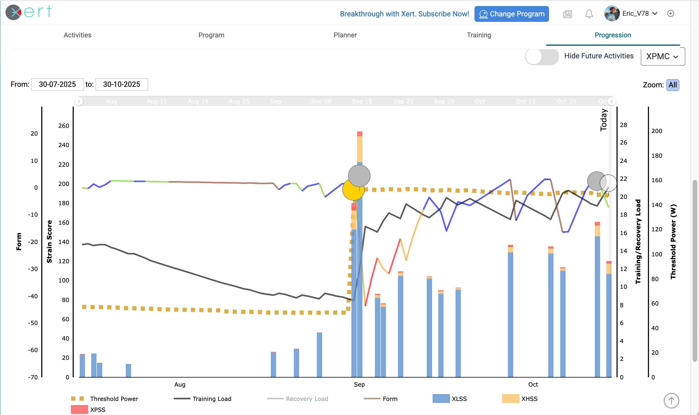 Select the Progression tab, select 3 months in dropdown, scroll down to the XPMC and all your BT circles are shown during that period. You don’t need lots of them but you do need a few to establish an accurate fitness signature.