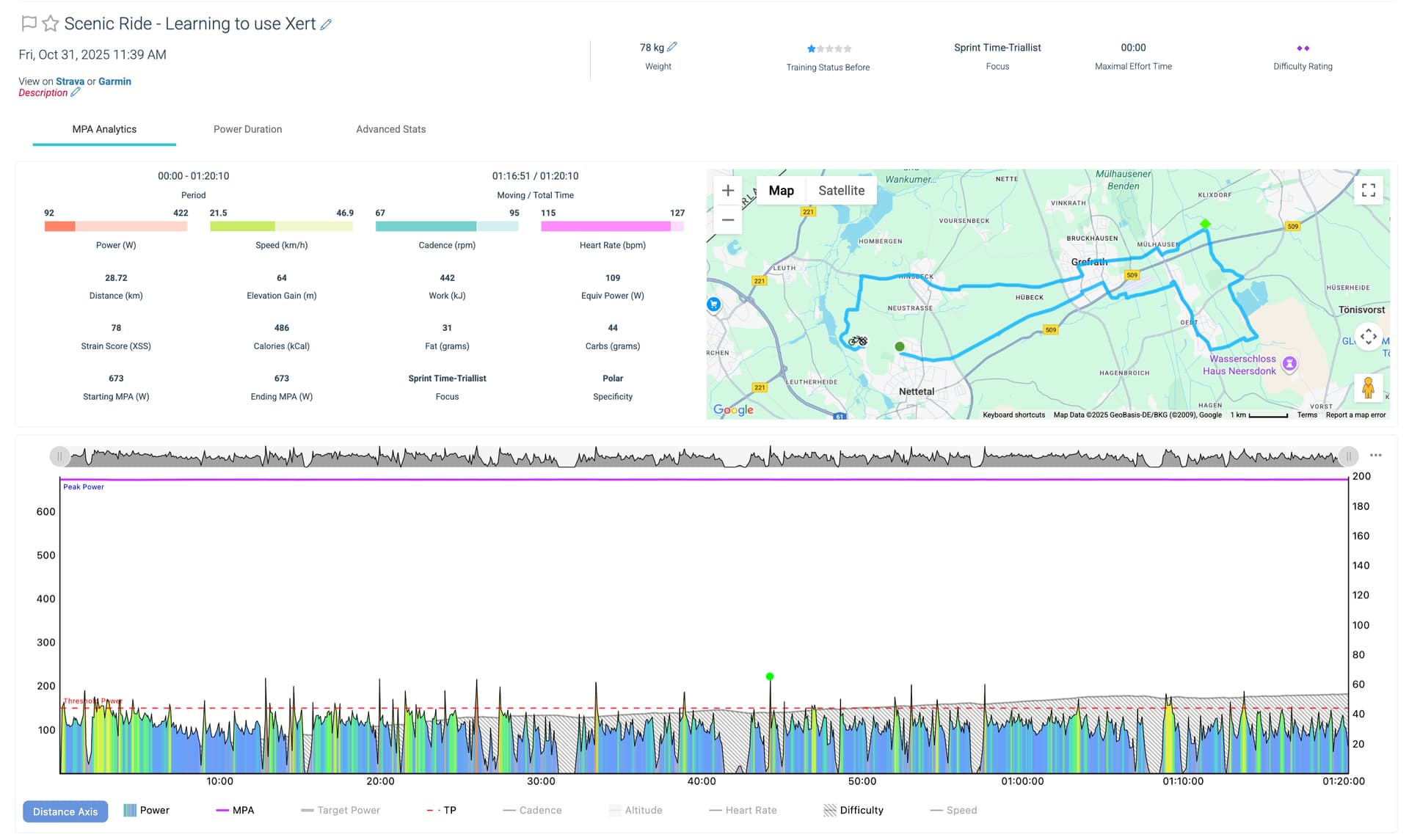 The power chart we need to view is the one below the data table that shows second by second power output along with magenta MPA line above and shaded portion indicating Difficulty Score.