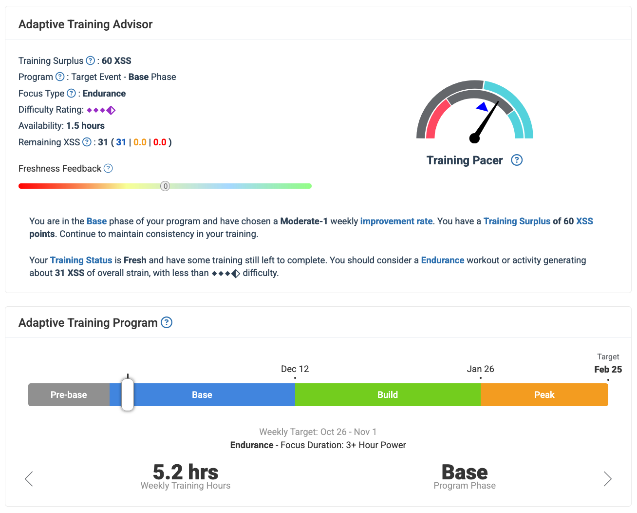 During Base phase XATA will only recommend endurance level workouts and the daily XSS ratio will default to xxx|0|0 (low/high/peak).