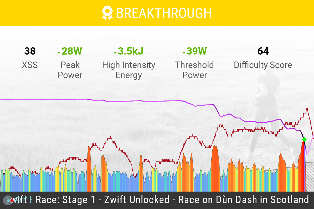 I just did Stage 1 of Zwift Unlocked, which was a punchy 16m30s race (so very short) with some kickers. I got some all-time Power PBs ranging from 4m to 15m that I cannot fully believe myself as they are a significant improvement over my previous ones. More on that later.