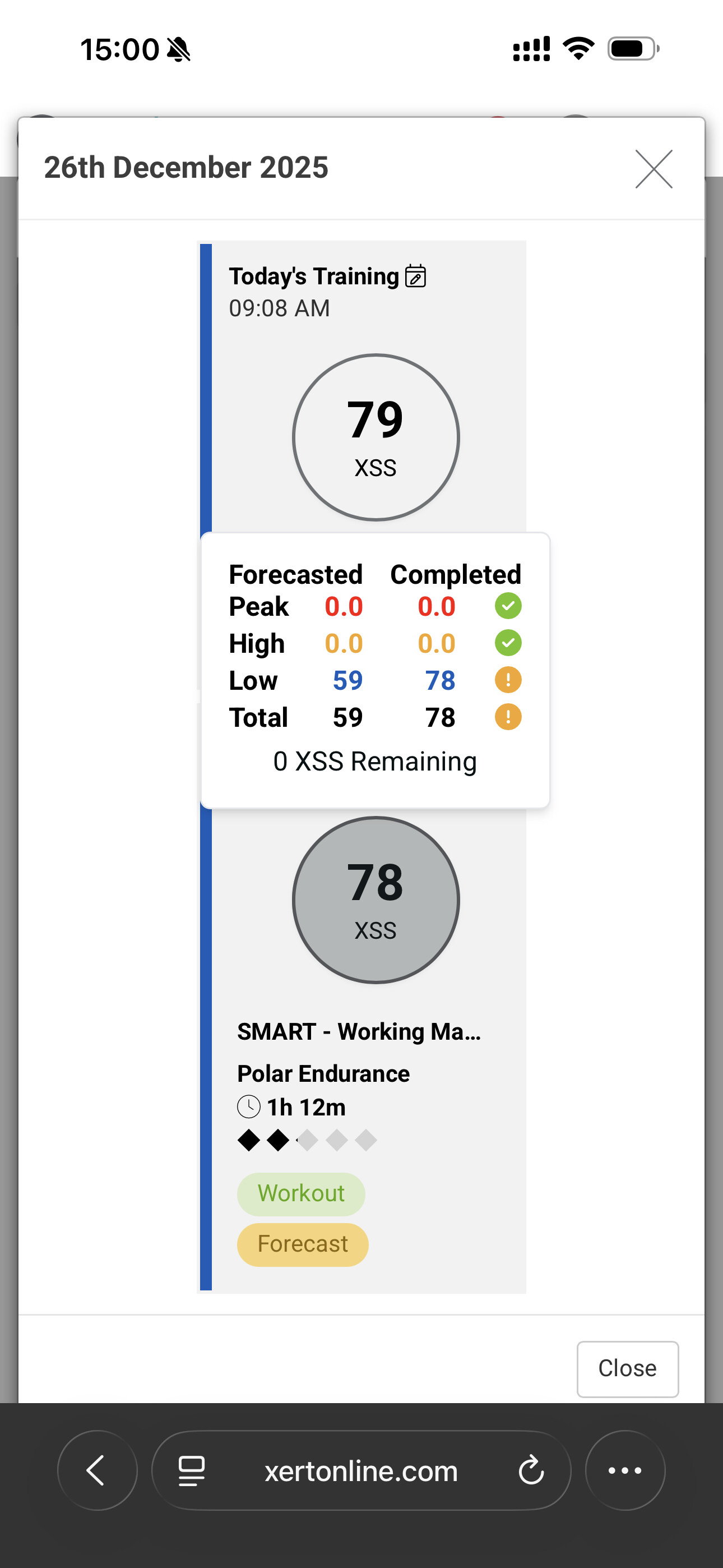 The forecast comparison inside the completed workout to reference the original daily forecast (79 XSS), not a reduced number (59 XSS) that was never visible beforehand.