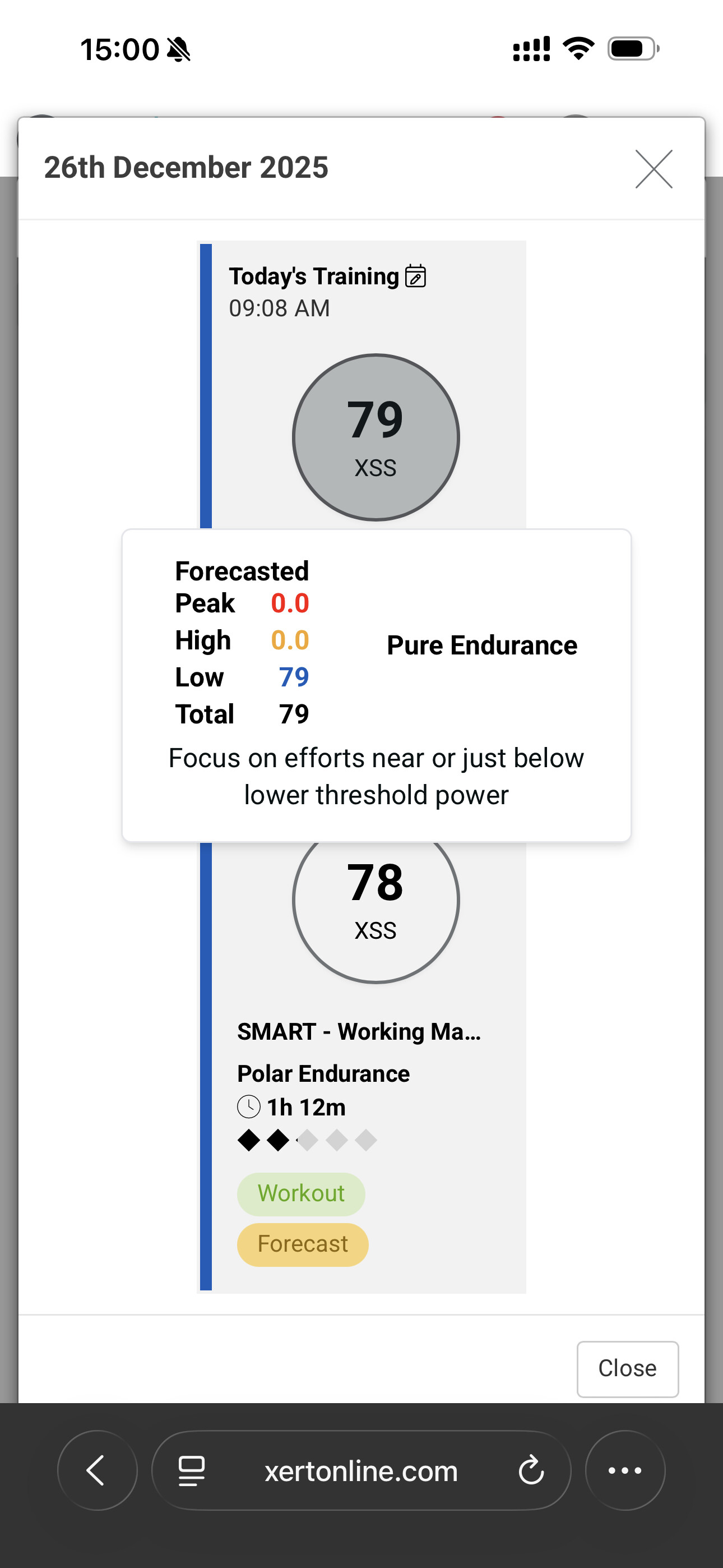 On a given day, the Planner shows a Daily Forecast of 79 XSS (Low only / Pure Endurance).