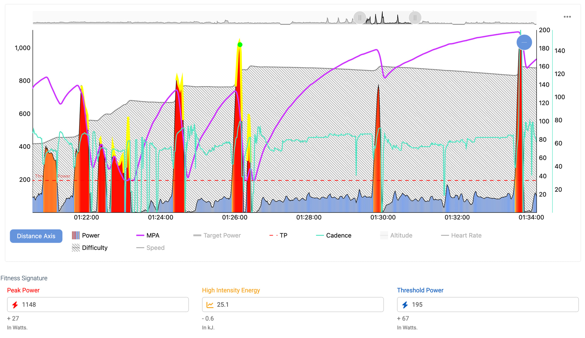 When I correct my max power to 1230 W (I can’t reach that indoors because my Taxc Neo 2T slips somewhere around 1170 W) and extract again, I get somewhat more sensible TP values but PP and HIE look too high: PP 1312, HIE 32.7, TP 221 in this case.