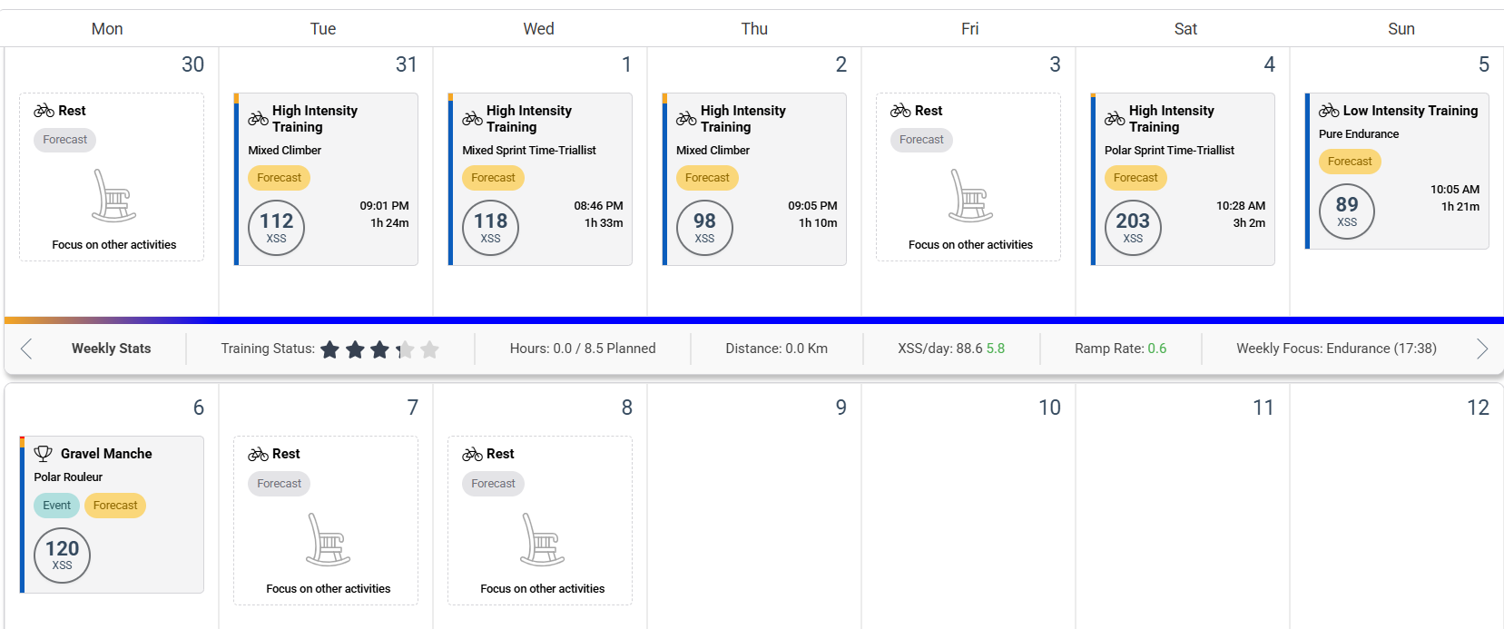 None of the prior week’s HIT workouts are above your 3+ status stars level and calculated form is back to fresh the next day. If that’s not the case and you don’t feel back to blue by the weekend, you can shorten the duration of the HIT on Saturday and ride the Sunday endurance as easy as you like.