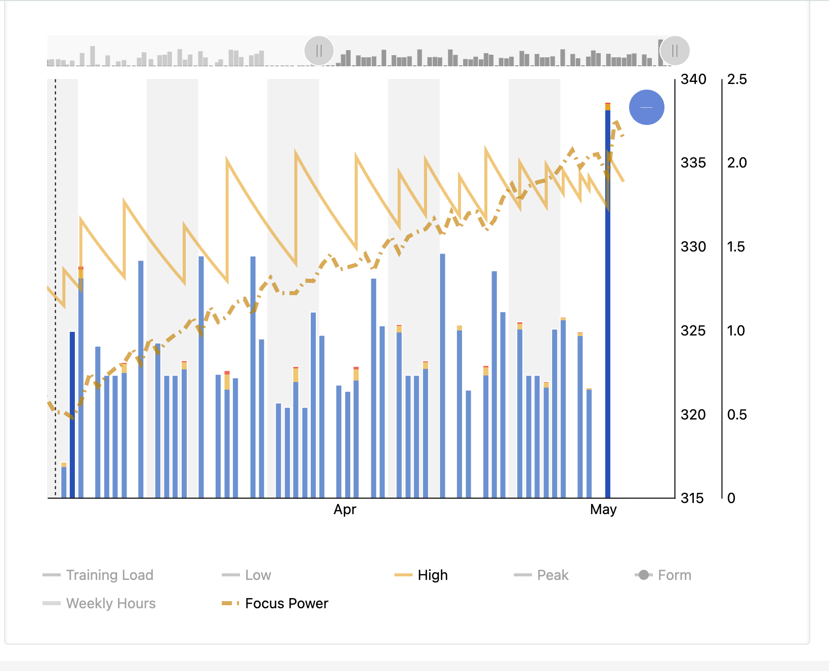 Do a long Z2 ride but finish with hard sprints → your Focus may quickly drop to ~5 min, because those intense efforts shift the balance of Peak:Low strain