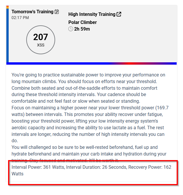 When going to the ‘Choose my training’ overlay, Xert gives a target Interval Power that seems way too high for the focus of the training. For example, I have a training sessions with ‘Polar Climber’ focus (10 minute power’) and a target Interval Power of 361 Watts (interval duration: 26 seconds). Howerver, my 10 minute power right now is only 269 Watts. This does not seem to make sense?