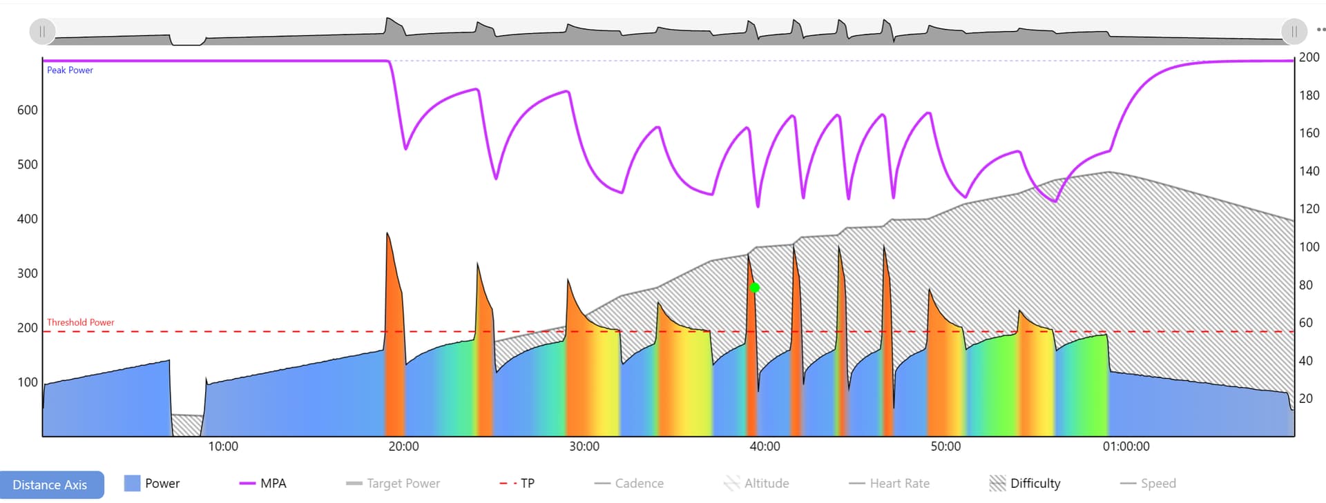 Threshold Power is a parameter of your Fitness Signature that represents the highest power that can be sustained without accumulating short-term fatigue – e.g. without MPA decreasing.